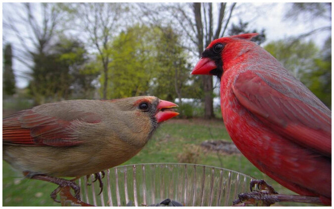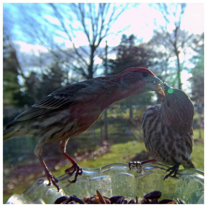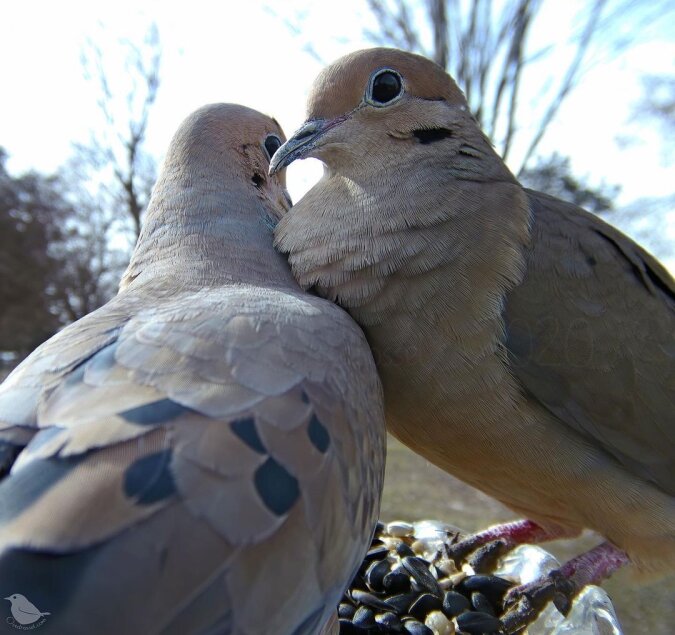 Ta para pojawiła się przy moim karmniku zeszłej nocy. Wygląda na to, że jedzą romantyczną kolację. Samiec karmi samicę. Wygląda bardzo uroczo.