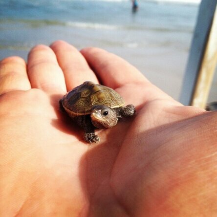 Ten mały żółwik prawie padł ofiarą mew. Bezczelne ptaki zostały odpędzone.