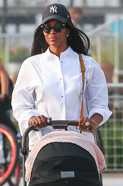 Modelka była ubrana w białą koszulę, czarno-zielone luźne spodnie, trampki i czapkę bejsbolową z logo New York Yankees. Campbell szła powoli z córką w wózku i wyglądała na absolutnie szczęśliwą.