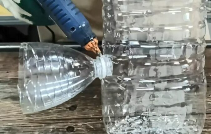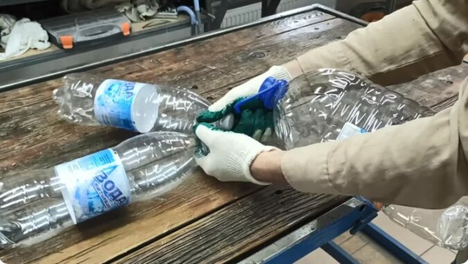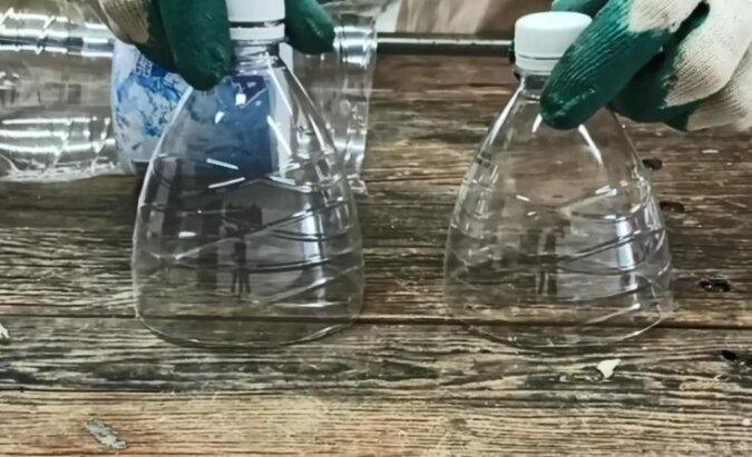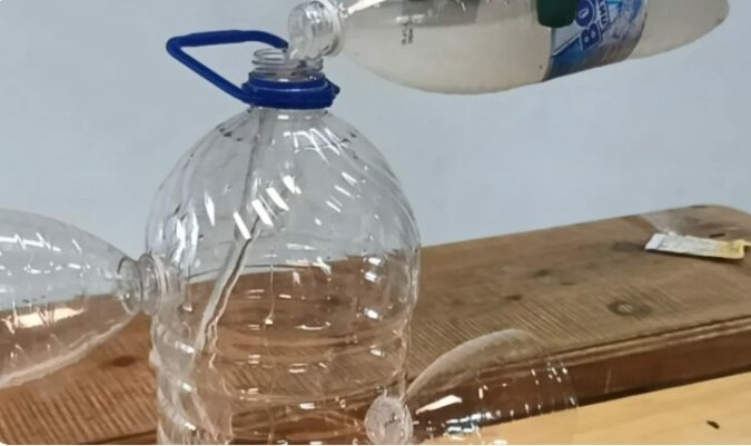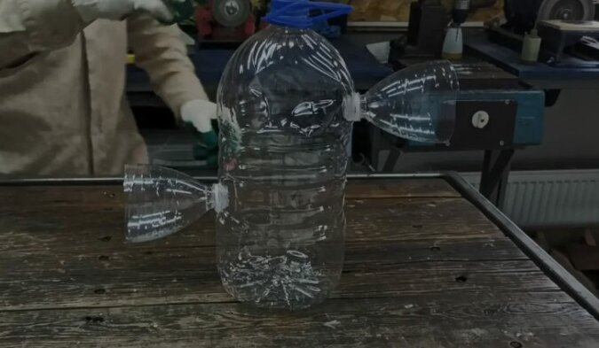 Następnie w pięciolitrowej butelce wycinamy dwa otwory, które powinny pokrywać się ze średnicą szyjek półtoralitrowych butelek.