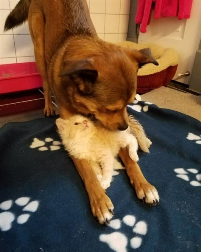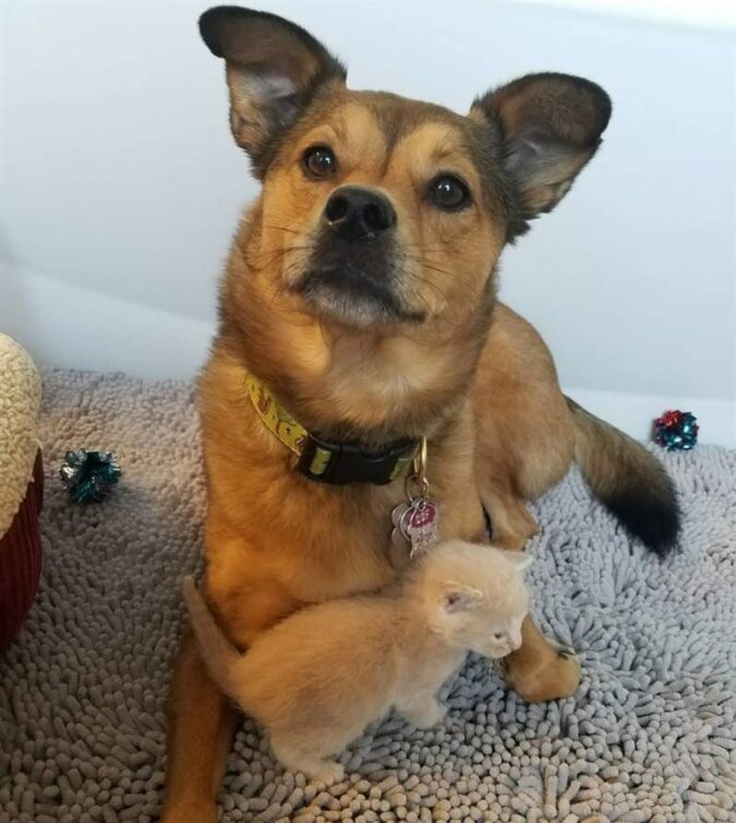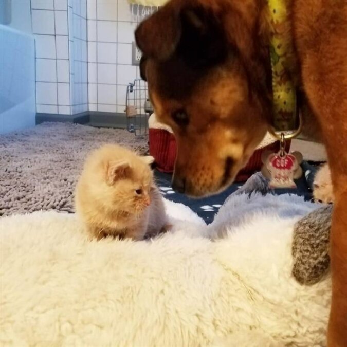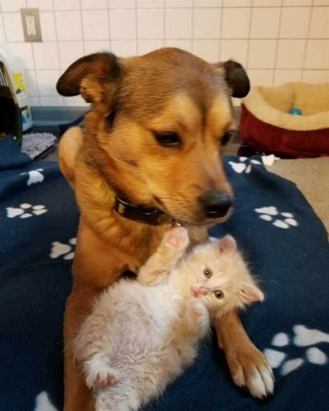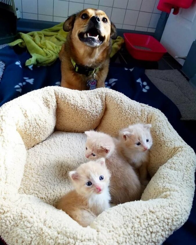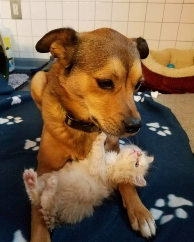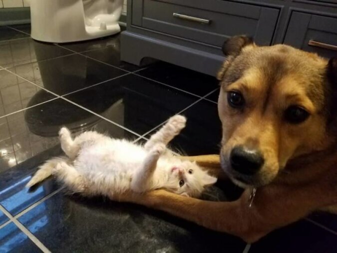 Pies zawsze zachowuje się bardzo spokojnie, aby nie wystraszyć ludzi i ten sam schemat zachowania sprawdza się u kociąt.