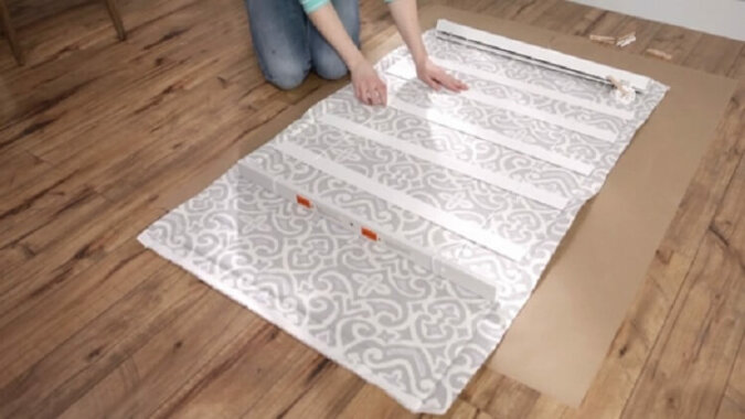 Po wewnętrznej stronie tkaniny rozłóż żaluzje tak, aby zachować taką samą odległość między listwami: w ten sposób utworzysz przyszłe fałdy.