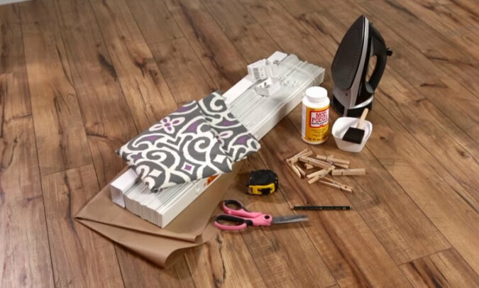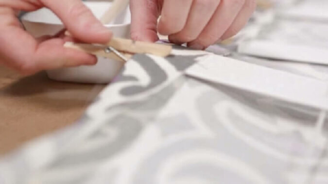 Za pomocą pędzla posmaruj wnętrze listwe klejem i delikatnie przyklej do tkaniny. Nie jest konieczne całkowite sklejenie całego paska, wystarczy zamocować krawędzie. W ten sam sposób przyklej gzyms i zaciśnij wszystkie punkty klejenia za pomocą spinaczy do bielizny.