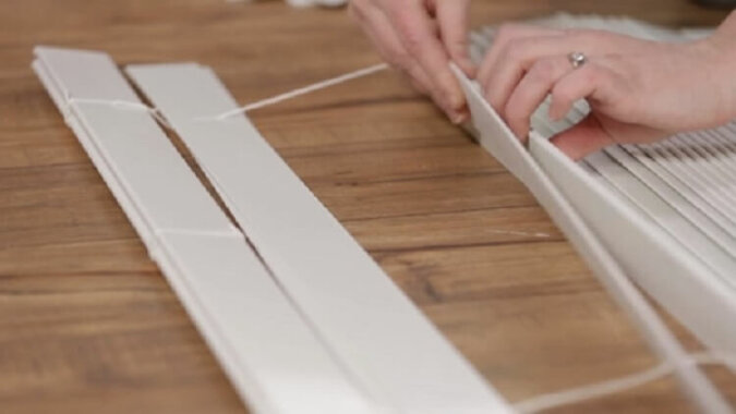Weź żaluzje i przetnij na nich poprzeczne liny, aby główna podłużna pozostała nienaruszona. Podniesie i opuści naszą zasłonę. Teraz odlicz 7 listew i usuń resztę.