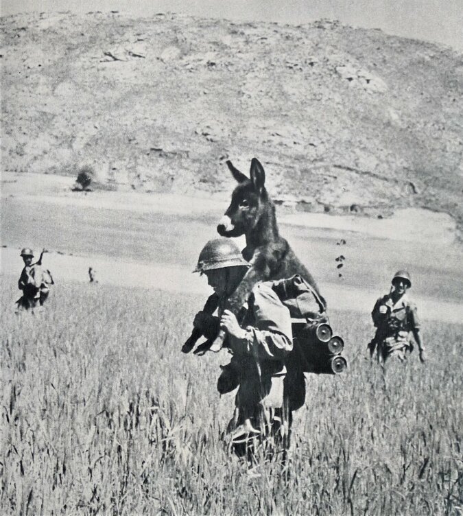 Oryginalne zdjęcie ma własną fascynującą i motywującą historię. To zdjęcie zostało zrobione w Algierii, w środku lata 1958 roku. Wtedy kolonia walczyła o niezależność od francuskiego protektoratu. Żołnierze Legii Cudzoziemskiej podczas marszu znaleźli na poboczu drogi wycieńczonego osła. W tym czasie zwierzęta juczne były szeroko wykorzystywane przez wojsko do transportu towarów. Mimo ciężkiego wojskowego plecaka żołnierz zarzucił osła na ramiona. Zlitował się nad nim, zdając sobie sprawę, że zwierzę umrze bez pomocy. Ten moment uchwycił korespondent wojenny.
