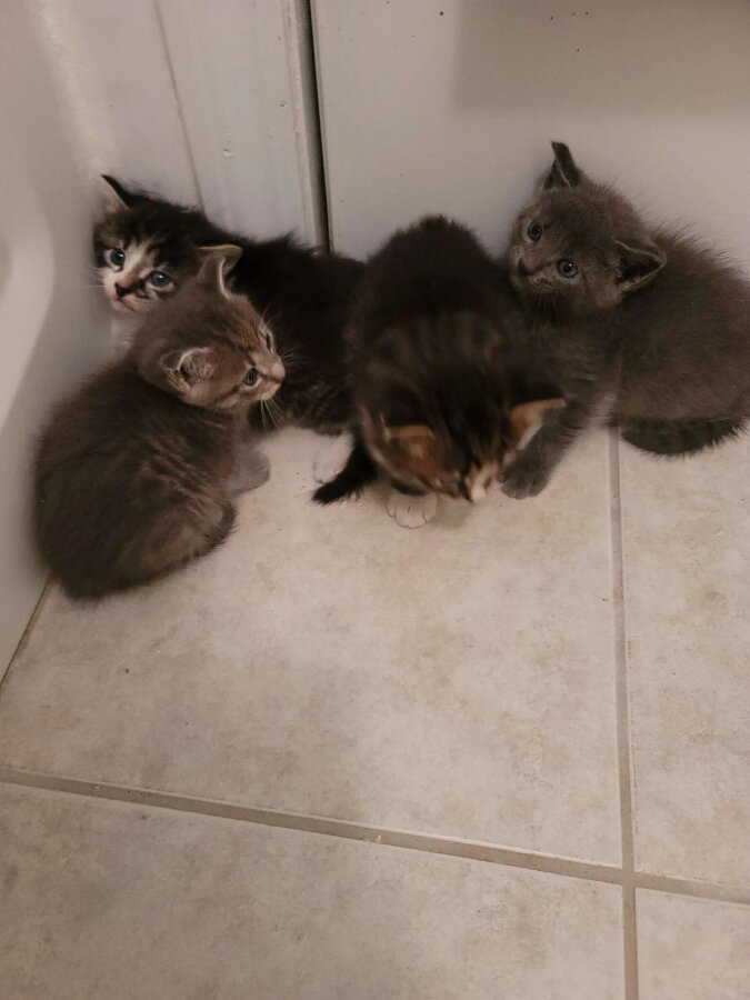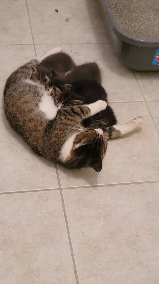 Jeffrey uznał, że rodzinie nie jest dobrze pozostawać na zimnej podłodze garażu, obok żelaza i narzędzi, które mogłyby zaszkodzić ciekawskim kociętom. Postanowił przenieść rodzinę do łazienki w domu - jest tam ciepło, przytulnie i można postawić kuwetę. Bez obaw że żwirek się znajdzie w całym domu. Prawie skończył przygotowania, kiedy jakby znikąd pojawiły się jeszcze dwa kociaki.