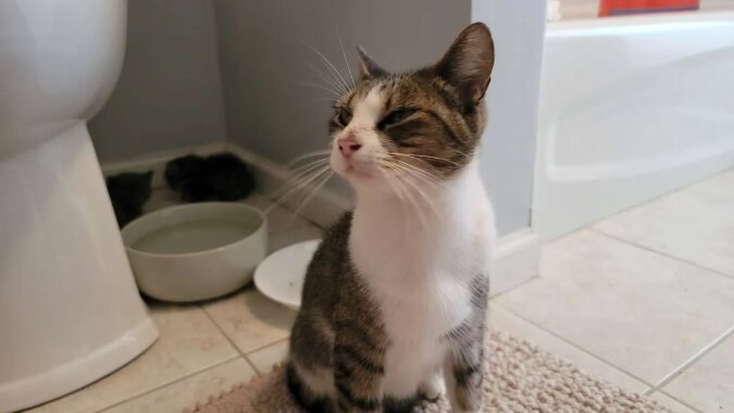 Mężczyzna zostawił całą rodzinę w łazience. Teraz można było poszukać odpowiedzi na pytanie – jak mama i kocięta trafiły do jego garażu? Nad jego werandą była kamera domofonu, która pomogła mu znaleźć odpowiedź. Na nagraniu z kamery było to widoczne: najpierw Amelia przeszukała okolicę i znalazła w jego garażu całkiem odpowiednie miejsce do ukrycia swoich dzieci. Wtedy przeniosła je – jeden po drugim za kark – i ukryła całą czwórkę za motocyklem. Myślała, że jest bezpieczna.