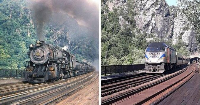 11. Pociągi w amerykańskiej wiosce Harpers Ferry w 1947 i 2021 roku