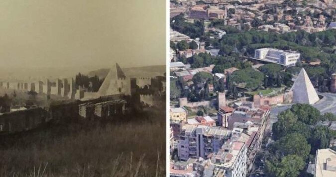 14. Jak piramida Cestiusza wyglądała w Rzymie w 1750 roku, a jka wygląda obecnie