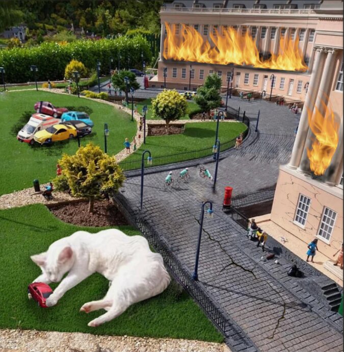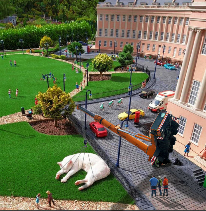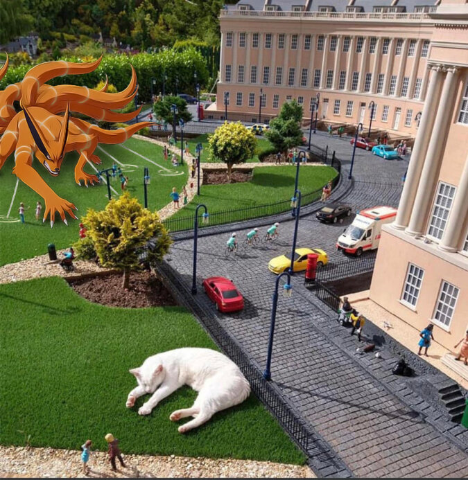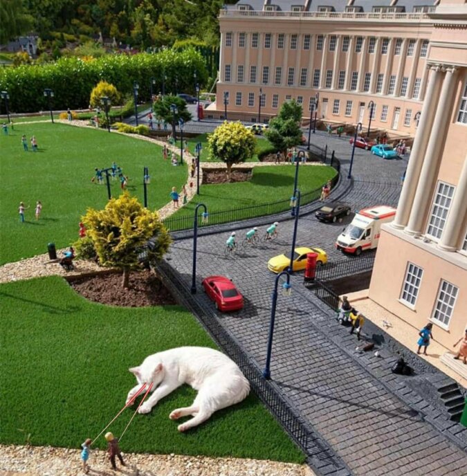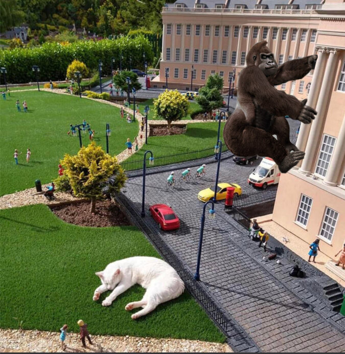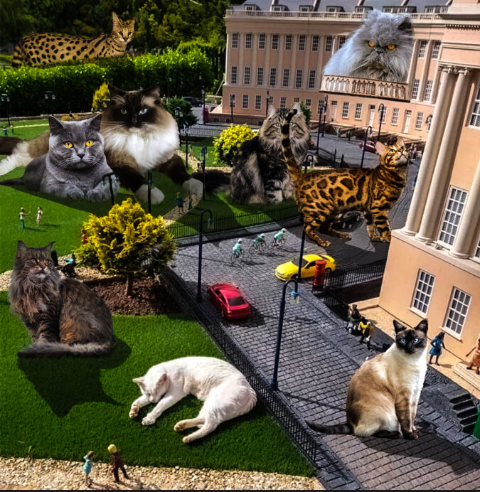 W mieście Bath (Wielka Brytania) kot położył się makiecie i spowodował pojawienie się z nim memów. Faktem jest, że zwierzak na tle makiety wygląda na ogromnego i nieproporcjonalnego do budynków i ludzi.