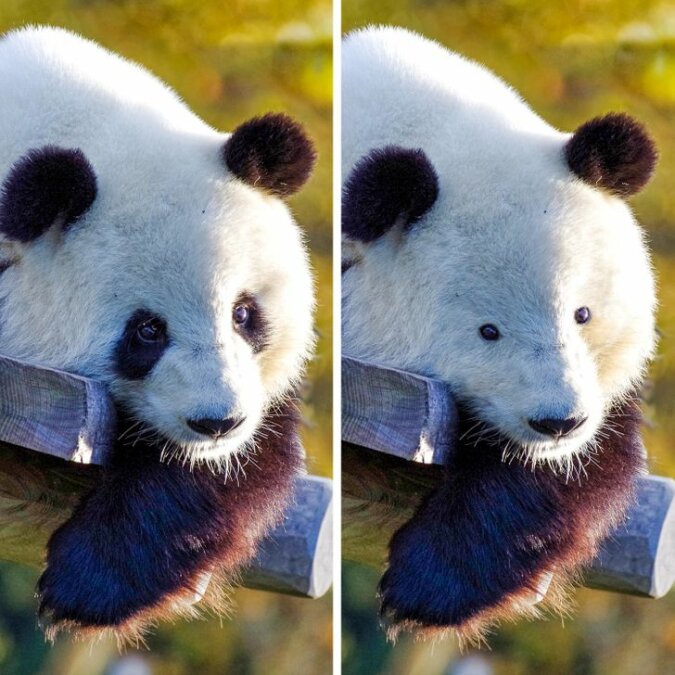 W rzeczywistości panda ma bardzo małe oczy, reszta to tylko farba