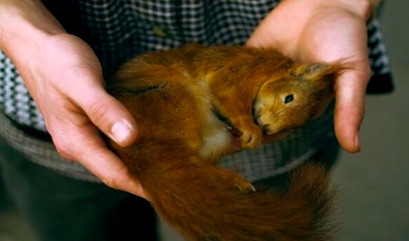 Podróż była krótkotrwała, a myśliwy czekał na nich we wskazanym miejscu. Obrońca zwierząt wziął małą, wyczerpaną wiewiórkę w ręce i wszedł do domu, aby udzielić pomocy medycznej.