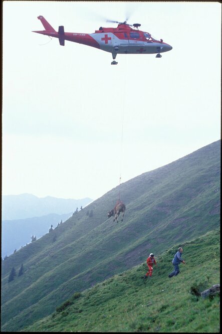 Ale co, jeśli krowa zraniła się w nogę i nie może z całym stadem wejść na pastwisko lub, co gorsza, nie może zejść z gór? Można by przewieźć ją ciężarówką, ale nawet jeep nie przejechałby wąskimi górskimi szlakami. Tu z pomocą tradycji przychodzą nowoczesne technologie. Rolnicy płacą za podróż zranionej krowy - przylatuje osobisty helikopter.