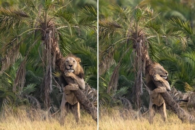 Ogromne zwierzę zbliżyło się do samotnej palmy i zaczęło przytulać się do drzewa, a potem lew zrobił taką minę, że rozkochał w sobie wielu internautów. W takim filmiku stał się podobny bardziej do kota, z którym właściciele nie bawili się przez kilka dni. Jednak to tylko przyniosło popularność tym zdjęciom, które szybko zebrały ogromną liczbę polubień w sieciach społecznościowych.