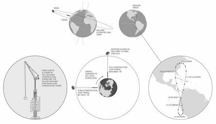 Budynek będzie nosił nazwę Analemma Tower, a architekci proponują jego budowę nad Dubajem, gdzie nieruchomości są 15 razy tańsze niż w Nowym Jorku. Już zmontowane moduły zostaną podniesione z Ziemi, przymocowane do rozkładanej podstawy wieży, która zostanie przymocowana kablami do asteroidy. „Ponieważ nowa typologia wieży jest dosłownie zawieszona w powietrzu, można ją zmontować w dowolnym miejscu, a następnie przetransportować w wyznaczone miejsce” – mówią architekci. Kontrola asteroida nie jest już fantazją, powiedzieli, a NASA zaplanowała już misję kontroli asteroidów w 2012 roku.