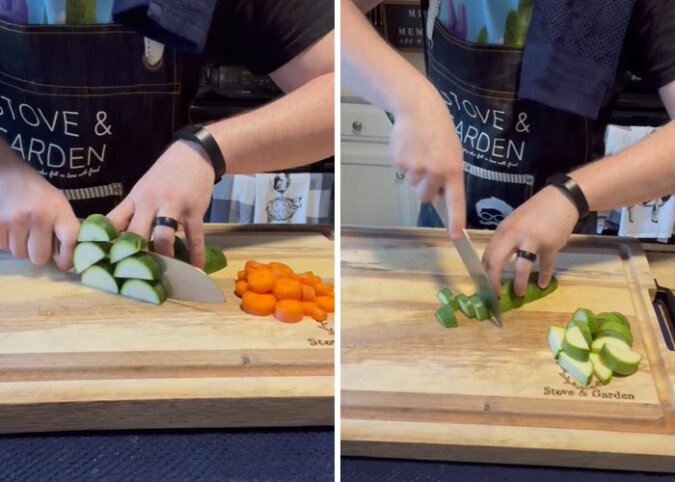 Aby kawałki warzyw nie przywierały do noża, przechylaj go i krój końcówką, a nie całym ostrzem