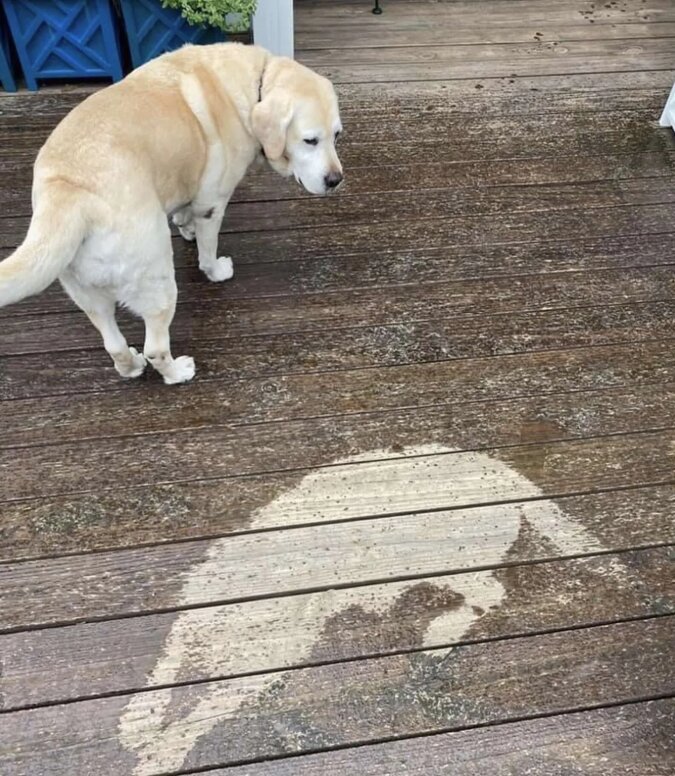 Wołali ją w kółko i w końcu Patsy wstała. Powoli, majestatycznie i niechętnie. W końcu była gotowa wejść do domu, chociaż deszcz prawie się skończył. Wtedy właściciele psa zauważyli coś, przez co nie mogli już powstrzymać śmiechu. Wyglądało na to, że Patsy zostawiła swojego bliźniaka na werandzie!