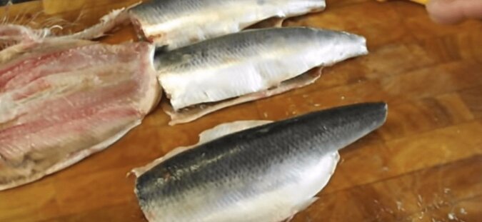 Śledź należy położyć na desce nacięciem w dół, otwierając boczne części z obu stron i dociskając dłonią wzdłuż grzbietu tak, aby tusza trzymała się tylko na skórze.