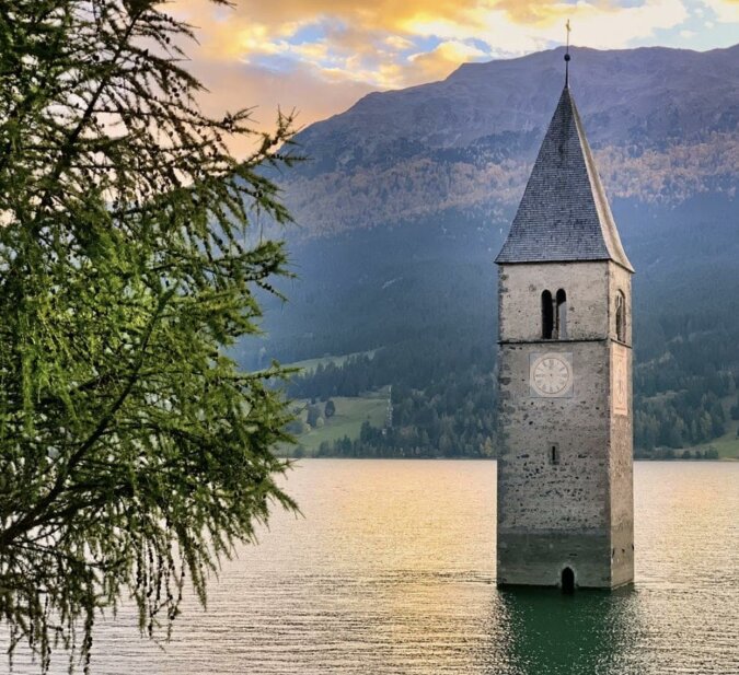 Wieża średniowiecznego kościoła wznosi się nad jeziorem Rezia we Włoszech, jako pomnik kilku wiosek zalanych w celu stworzenia sztucznego jeziora do produkcji energii elektrycznej.