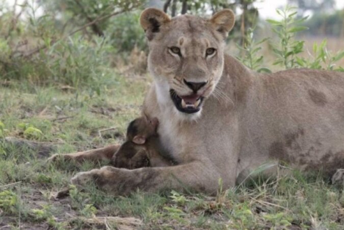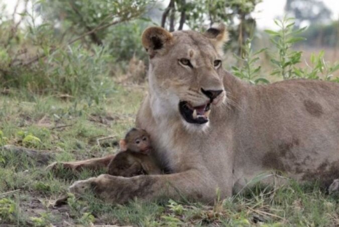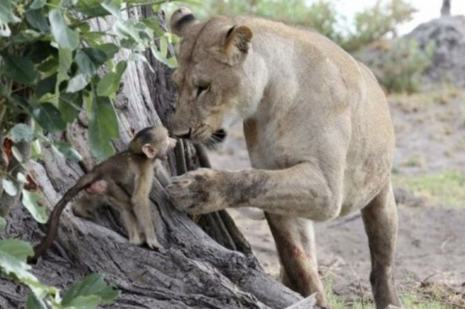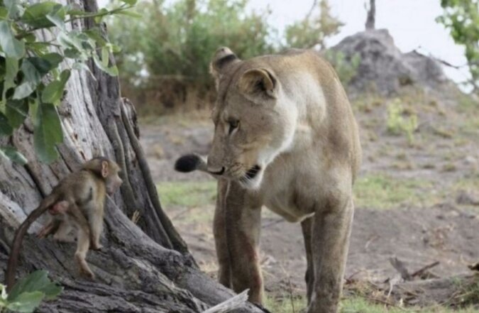 Kiedy młode zostało pozostawione bez uwagi lwicy, pawian szybko go złapał i przeniósł na drzewo. Nie wiadomo, dlaczego drapieżnik odmówił zabicia maleństwa. Ale prawdopodobnie lwica okazała współczucie i zdecydowała nie krzywdzić słabego i bezbronnego zwierzęcia.