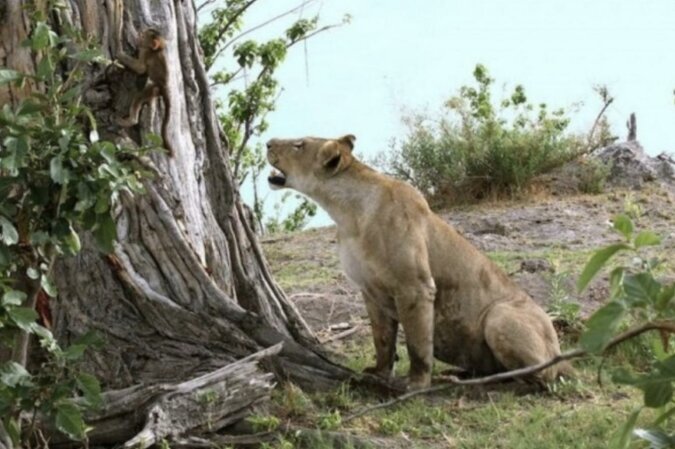 Lwica, zdając sobie sprawę, że ofiara ucieka, rzuciła się za nią. Ale pawian okazał się tak mały, kruchy i bezradny, że mimo wszelkich wysiłków nie mógł się wdrapać na drzewo.