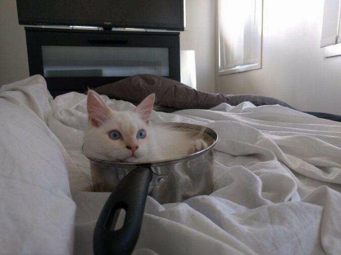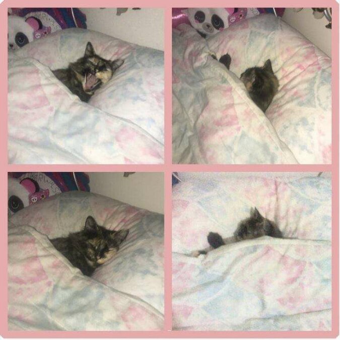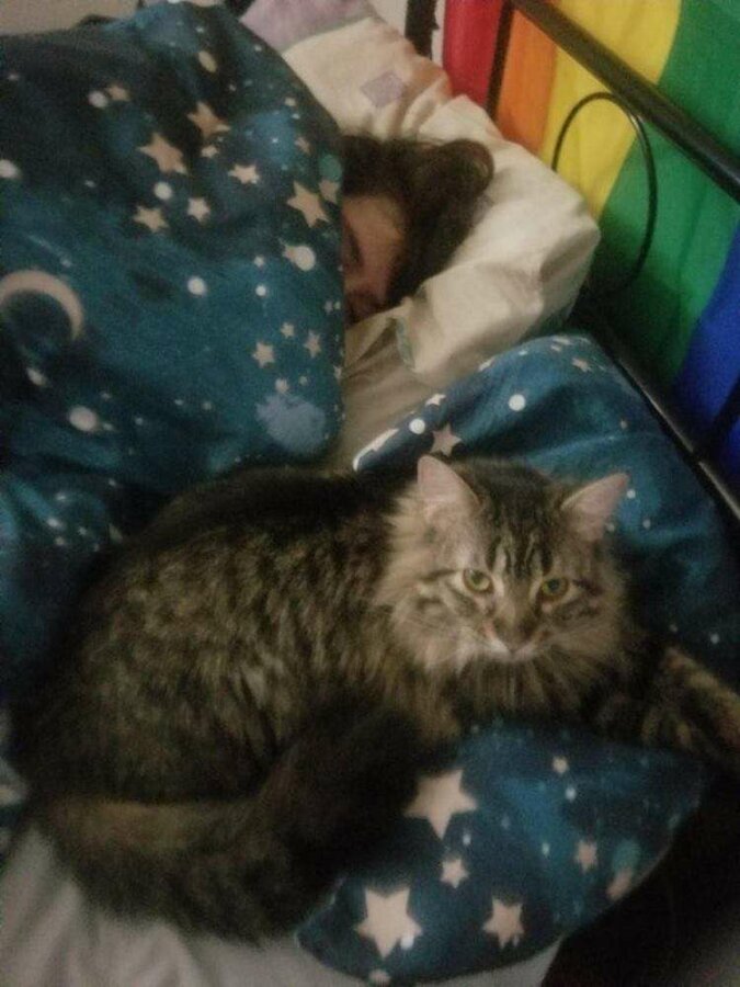 Młodsza właścicielka całą noc ogrzewa łóżko, rano wychodzi do szkoły, a kotka zajmuje miejsce
