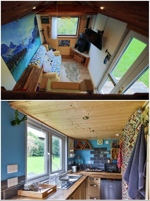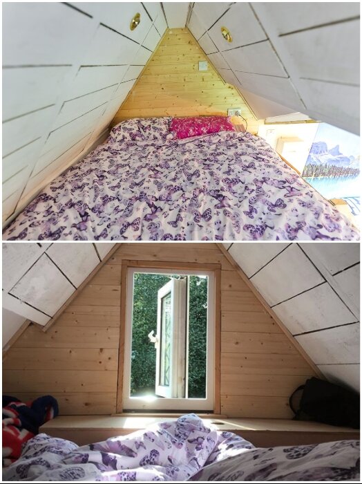 Ten mały domek ma dwa poziomy. Pierwszy z nich to salon z wygodną sofą i systemem multimedialnym, mała kuchnia, do której część mebli chłopiec wykonał sam, kabina prysznicowa i toaleta.