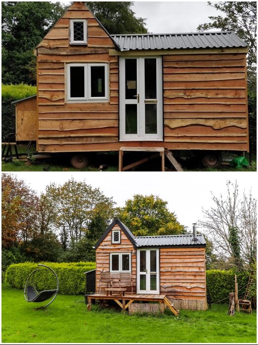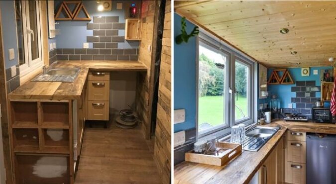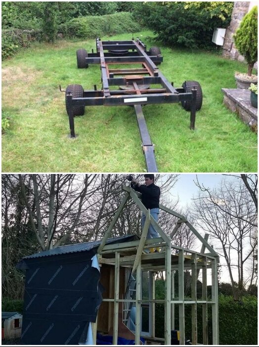 Za podstawę posłużyła rama starej przyczepy, a do reszty konstrukcji użyto materiałów z odzysku. Tom odbył kiedyś praktykę w budownictwie, a wiedza, którą wtedy zdobył, bardzo mu się teraz przydała. Z łatwością potrafił zaprojektować wnętrze domku.