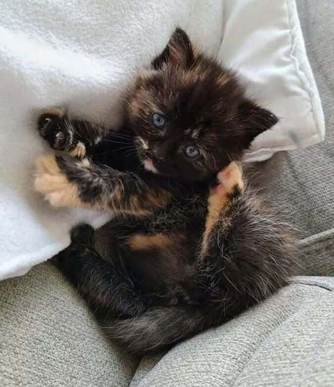 Już w mieście u weterynarza ustalono przybliżony wiek - nie więcej niż cztery tygodnie. Kotek był wychudzony, ważył zaledwie 400 gramów, ale odmawiał przyjmowania pokarmu. Ciągle mu czegoś brakowało - dziecko nie mogło prawie nic zrobić, a nie było kogo uczyć. Arianna musiała zostać kocią nianią i zacząć od zera.