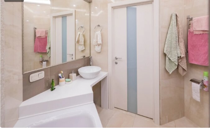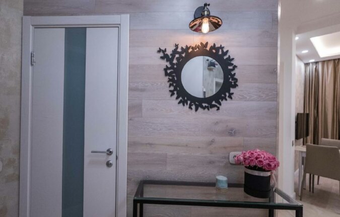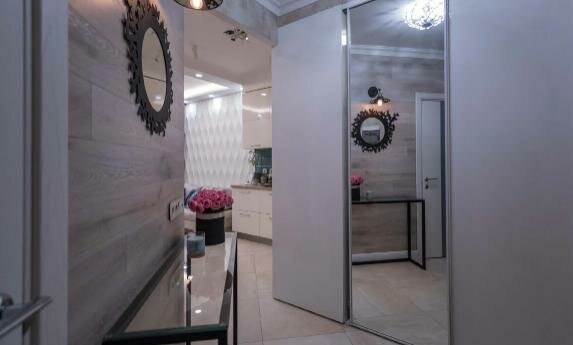 Na prawo od wejścia do mieszkania znajduje się oddzielna garderoba. Oddzielona jest od reszty mieszkania przesuwnymi lustrzanymi drzwiami.