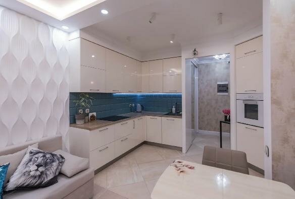 W kuchni zastosowano jasne i błyszczące fronty. W ten sposób pomieszczenie wypełnia się światłem.