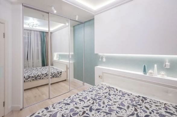 To pomieszczenie jest najbardziej przestronne. Wbudowana szafa ukryta jest za lustrzanymi drzwiami.
