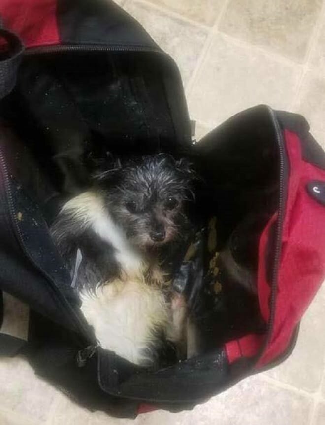 Tak właśnie stało się z maleńkim psem, którego ktoś wyrzucił. Siedział w ciasnym plecaku i piszczał ze strachu i głodu...