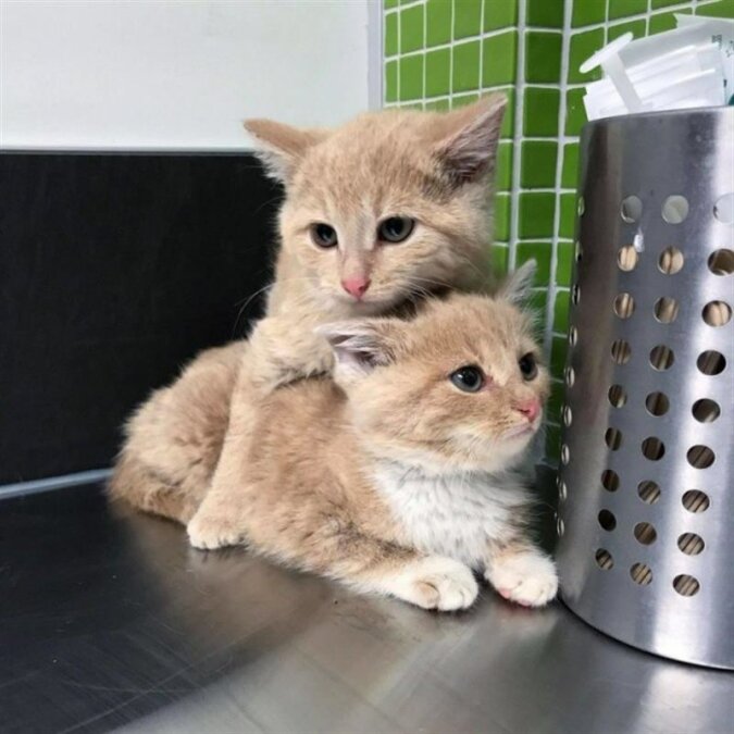Miejscowy ratownik zwierząt rozstawił w okolicy humanitarne pułapki, za pomocą których schwytano kocięta wraz z ich matką. Dzieciaki, chłopiec i dziewczynka, były ze sobą zaskakująco związane - cały czas trzymały się razem.