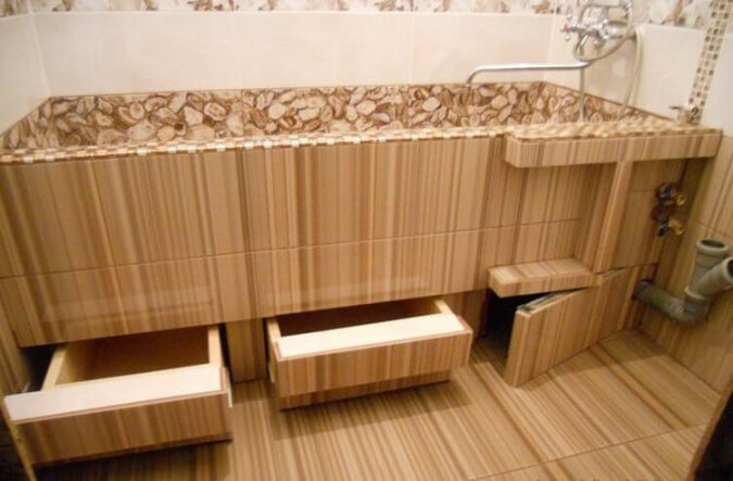 Sam spawał ramę z profilu metalowego. Montaż ramy przebiegł bez problemów – zaczęto robić oblicówkę. W trakcie prac zobaczono, że pod łazienką została przyzwoita przestrzeń. Postanowiono ją wykorzystać: wykonano drzwiczki dostępu do konserwacji oraz dwie szuflady do przechowywania detergentów.