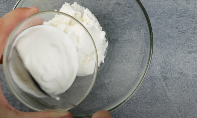Ten wypiek jest tak prosty, jak to tylko możliwe. W misce wymieszaj 200 g twarogu i 2 łyżki śmietany.