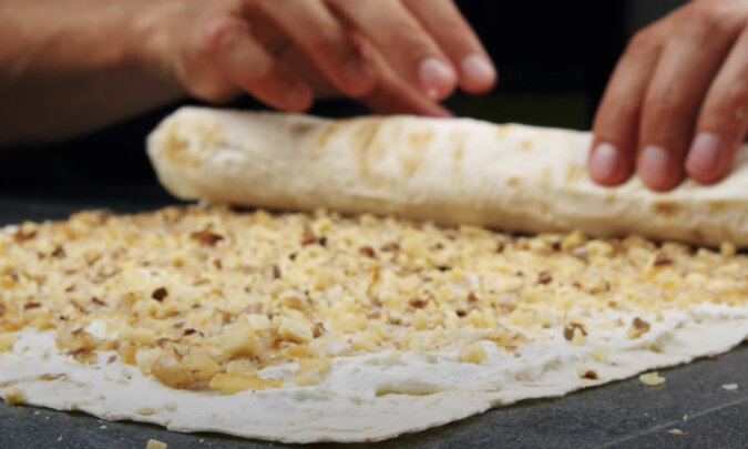 Rozłóż cienki lawasz, posmaruj masą twarogową, ułóż warstwę jabłek i posyp orzechami. W zasadzie nic nie stoi na przeszkodzie, aby dodać jeszcze kilka warstw dowolnych innych owoców, ale jabłka w zupełności wystarczą.