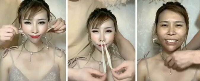 Zdjęcie 1. Ta dziewczyna całkowicie zmieniła kształt swojej twarzy za pomocą taśm i magii makijażu. Co ciekawe, prawie nie zmieniła kształtu swojego nosa za pomocą specjalnych nakładek, to tylko prawidłowe konturowanie.