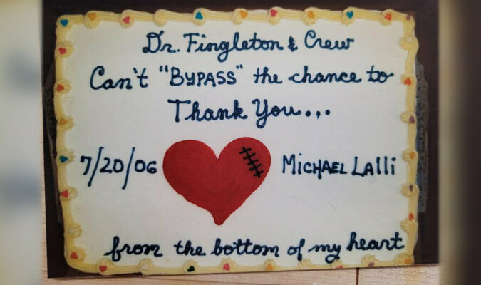 Po tym, jak jej ojciec wyzdrowiał, córka Michaela, Audra Lally, postanowiła podziękować lekarzowi na swój własny sposób. Od 15 lat właścicielka Mad Hatter Bakery robi ten sam tort i wręcza je chirurgowi, który uratował życie jej ojcu. Co roku 20 lipca Michael osobiście dostarcza prezent do szpitala. Na torcie, ozdobionym dużym czerwonym sercem, widnieje napis: „Dziękuję, dr Fingleton”.