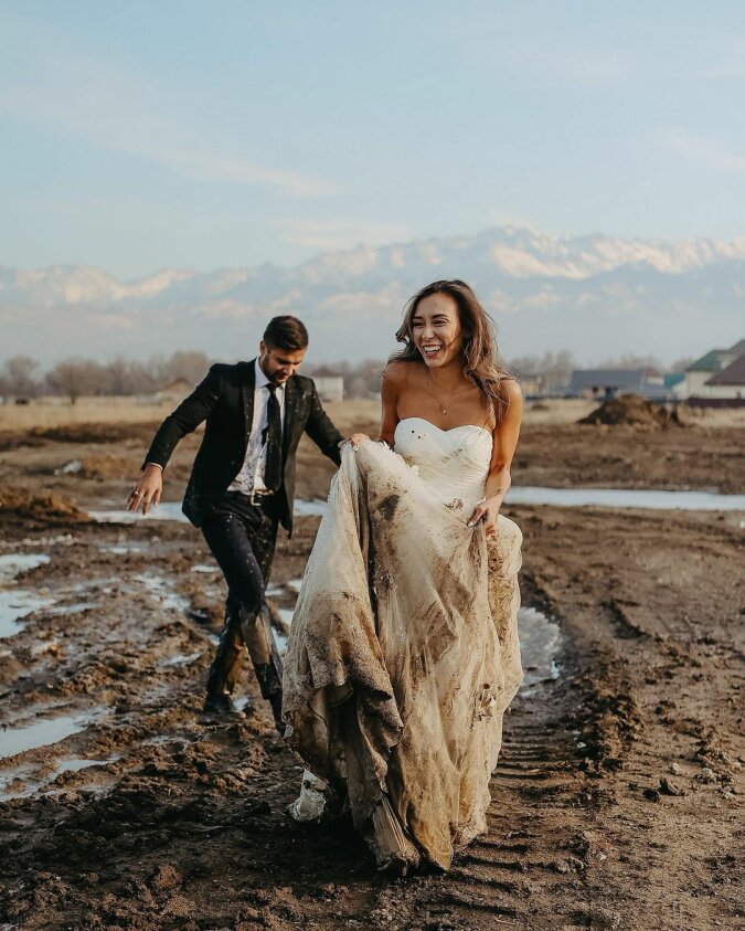 Pomyślelibyście, co można zrobić nowego w świecie fotografii ślubnej? Zdjęcia są mniej więcej takie same! Ale kiedy sprawy nie idą zgodnie z planem, powstają najlepsze ujęcia. Wszystko zaczęło się od tego, że para z Kazachstanu zażyczyła sobie nietypowego, górskiego tła. Wtedy na przeszkodzie stanęły kałuże i błoto.