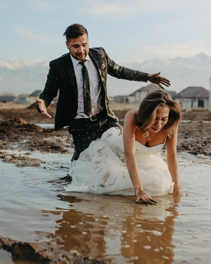 Pan młody nie był w stanie utrzymać panny młodej i nowożeńcy wpadli w błoto. Ale fotograf kontynuował robienie zdjęć, nawet gdy panna młoda głośno krzyczała na panna młodego. Właśnie w ten sposób para otrzymała kilka epickich ujęć!