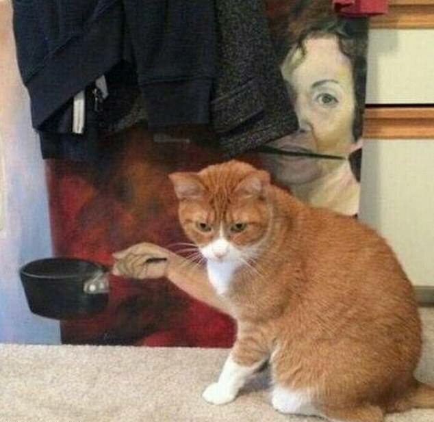 To tak, jakby kot trzymał garnek, do tego ludzką ręką, który tak naprawdę jest narysowany