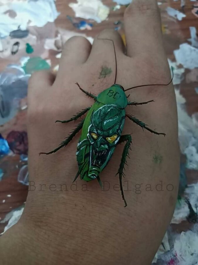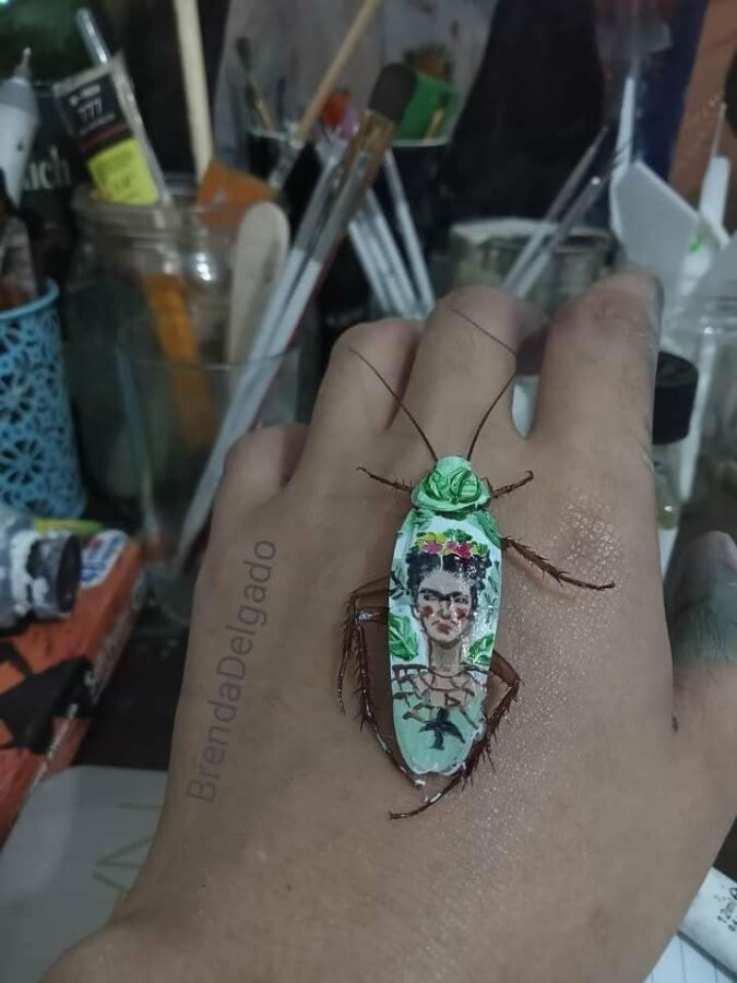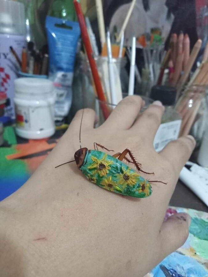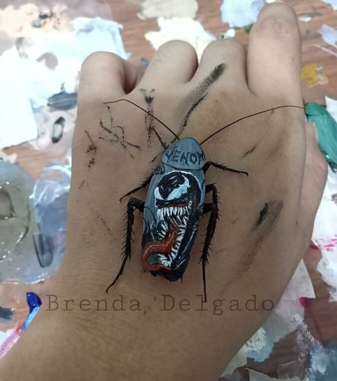 I wtedy dotarło do artystki, że to piękne płótno! Karaluchy są duże i jest dużo miejsca do malowania. Ich skrzydła są twarde i gładkie, błyszczą, więc farba na karaluchach wygląda idealnie. Co najlepsze, nikt nie robi czegoś takiego, więc jest szansa na zdobycie sławy. Poza tym, będąc miejscową, nie boi się tych owadów.