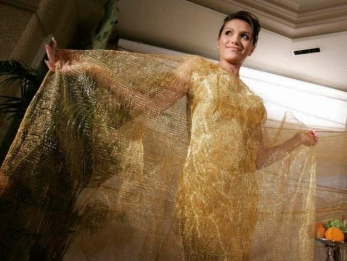 Sukienka z drutu została wykonana przez Ginza Tanaka. Ma słabość do koloru złotego. Strój waży ponad kilogram i kosztuje 245 000 dolarów.