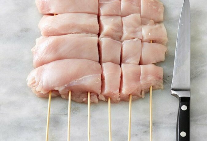 Nie chodzi o to, by kroić kurczaka na kawałki, a następnie nawlekać je jeden po drugim, ale by najpierw nakłuć mięso szpadkami, a dopiero potem pokroić. Ułóż kilka dużych kawałków filetu z kurczaka poziomo obok siebie, następnie należy nadziać na szpadki w odstępach kilku centymetrów, a następnie pokroić pionowo. Kawałki będą tej samej wielkości, a ich przygotowanie zajmie tyle samo czasu.