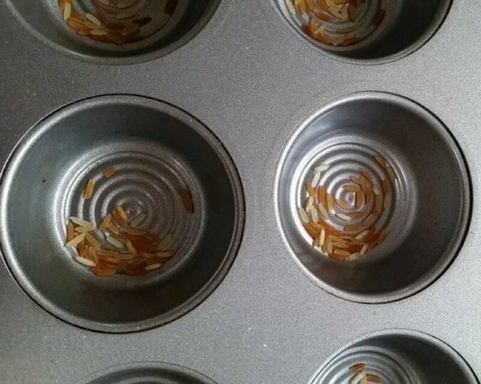6. Pozbądź się nadmiaru oleju. Aby muffinki nie były zbyt tłuste, dodaj do formy łyżeczkę nieugotowanego ryżu. Dzięki temu wchłonie nadmiar oleju.