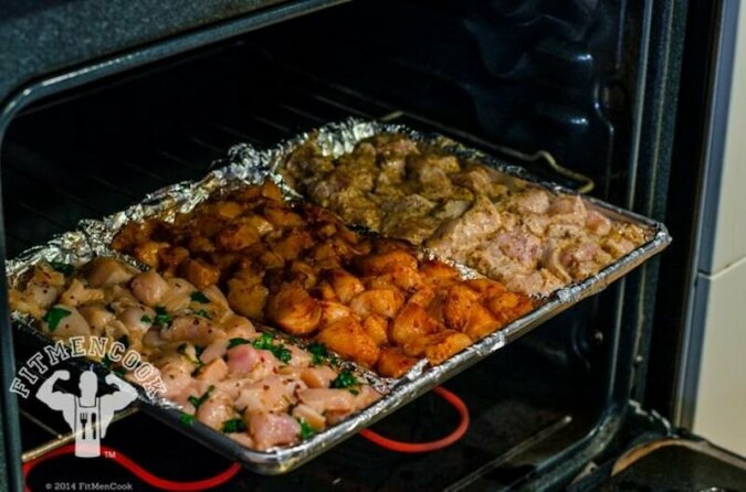 7. Zrób kilka potraw jednocześnie. Istnieją obecnie drogie piekarniki z technologią, która pozwala na robienie dwóch różnych potraw w tym samym czasie, ale istnieje prostszy sposób: wyłóż tacę folią i zrób przegrody. Wszystko, co musisz zrobić, to zamarynować mięso w trzech różnych sosach i włożyć do piekarnika.