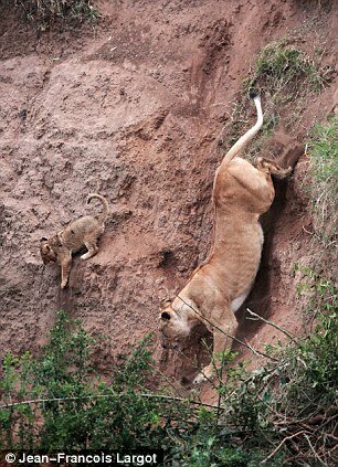 Trzy lwice i dwa młode lwy zaczęły nawet schodzić, by pomóc młodemu, ale miękka ziemia rozpadała się pod ich ciężkimi łapami. Cztery zwierzęta porzuciły to przedsięwzięcie i wróciły na twardy grunt, a tylko jedna samica kontynuowała schodzenie do przerażonego młodego.
