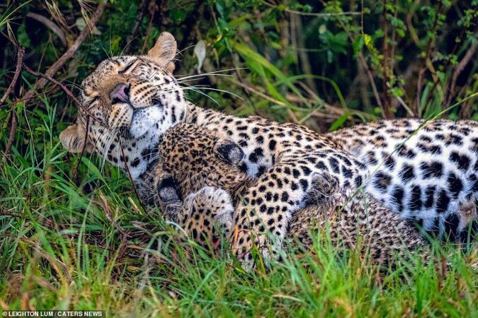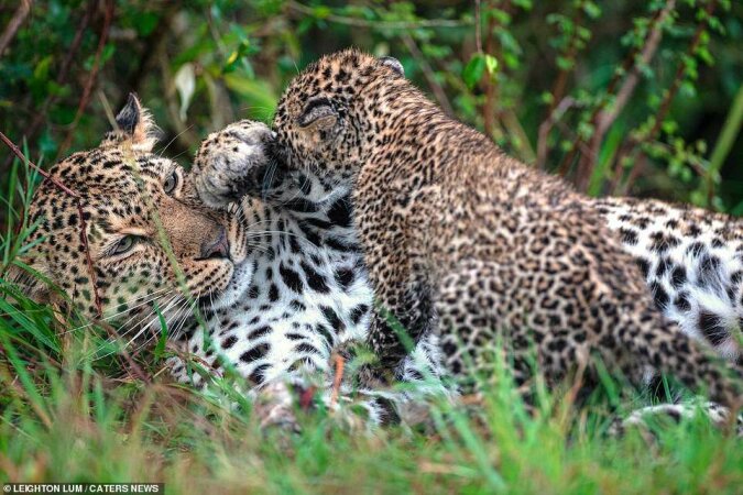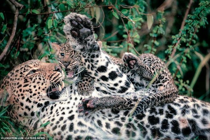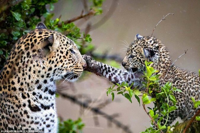 Wszystko to zostało sfotografowane w Kenii przez Leightona Luma, fotografa dzikiej przyrody, który zauważył młode dokuczające swojej mamie po tym, jak obudziła go nagła ulewa.