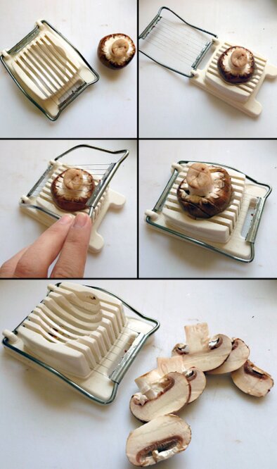 Zwykła krajalnica do jajek pomoże Ci w szybki sposób pokroić grzyby na sałatkę. Prawdopodobnie masz taką, ale bardzo rzadko używasz.